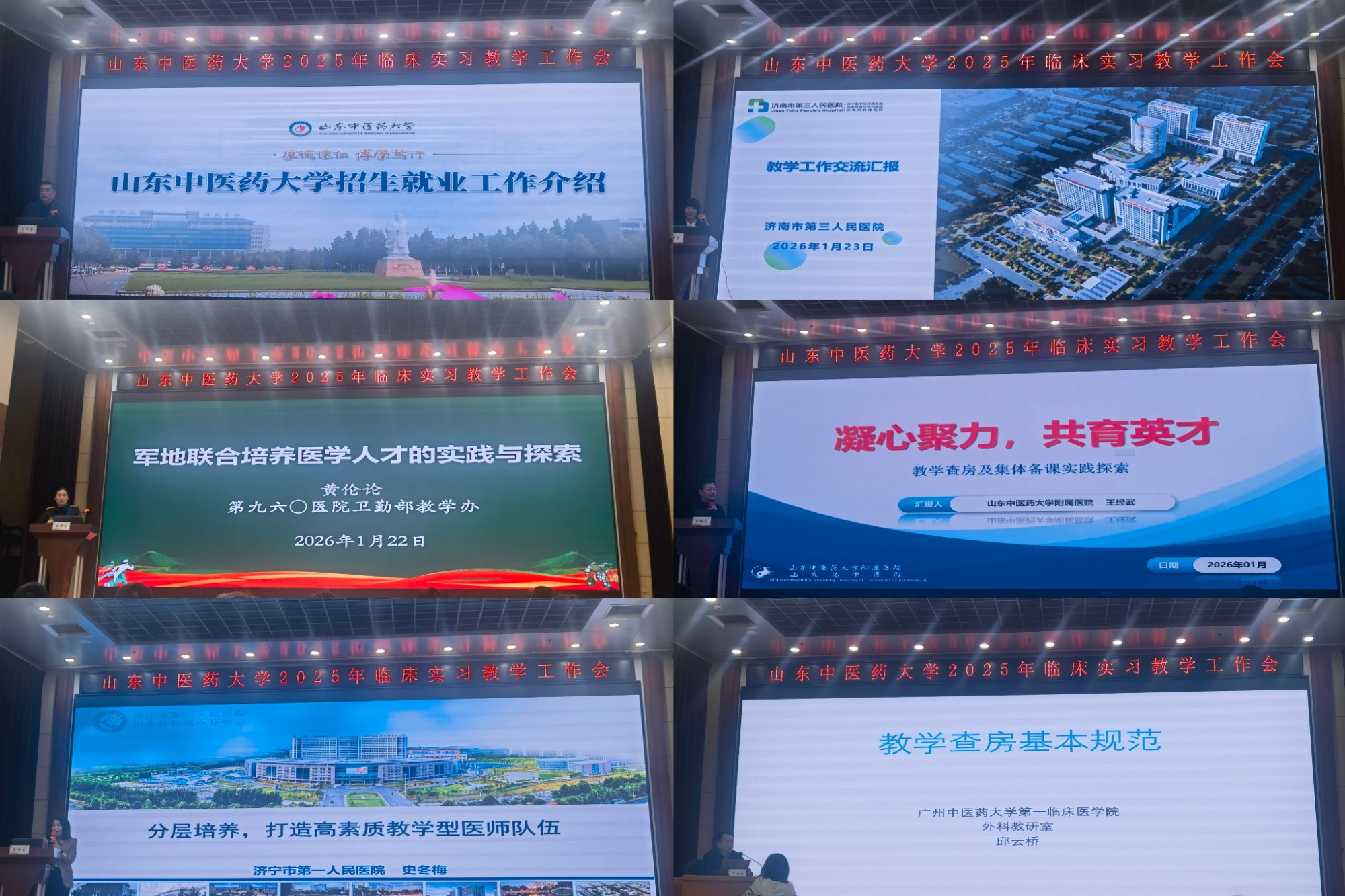 随后的专题分享环节干货满满。山东中医药大学招生就业处负责人从实习就业一体化建设角度,系统介绍了学校在招生、培养、就业全链条衔接方面的工作举措与成效。中国人民解放军联勤保障部队第九六〇医院、济宁市第一人民医院、济南市第三人民医院、山东中医药大学附属医院等4所优秀实践教学基地的代表,依次分享了各自在教学管理、实习带教、质量监控等方面的宝贵经验,为参会者提供了可借鉴的实践样本。广州中医药大学邱云桥教授以 “教学查房基本规范”为题开展专题授课,结合典型案例深入浅出地解析了教学查房的核心要点、流程标准与实施技巧,为规范临床教学查房行为、提升教学查房质量提供了专业指导。