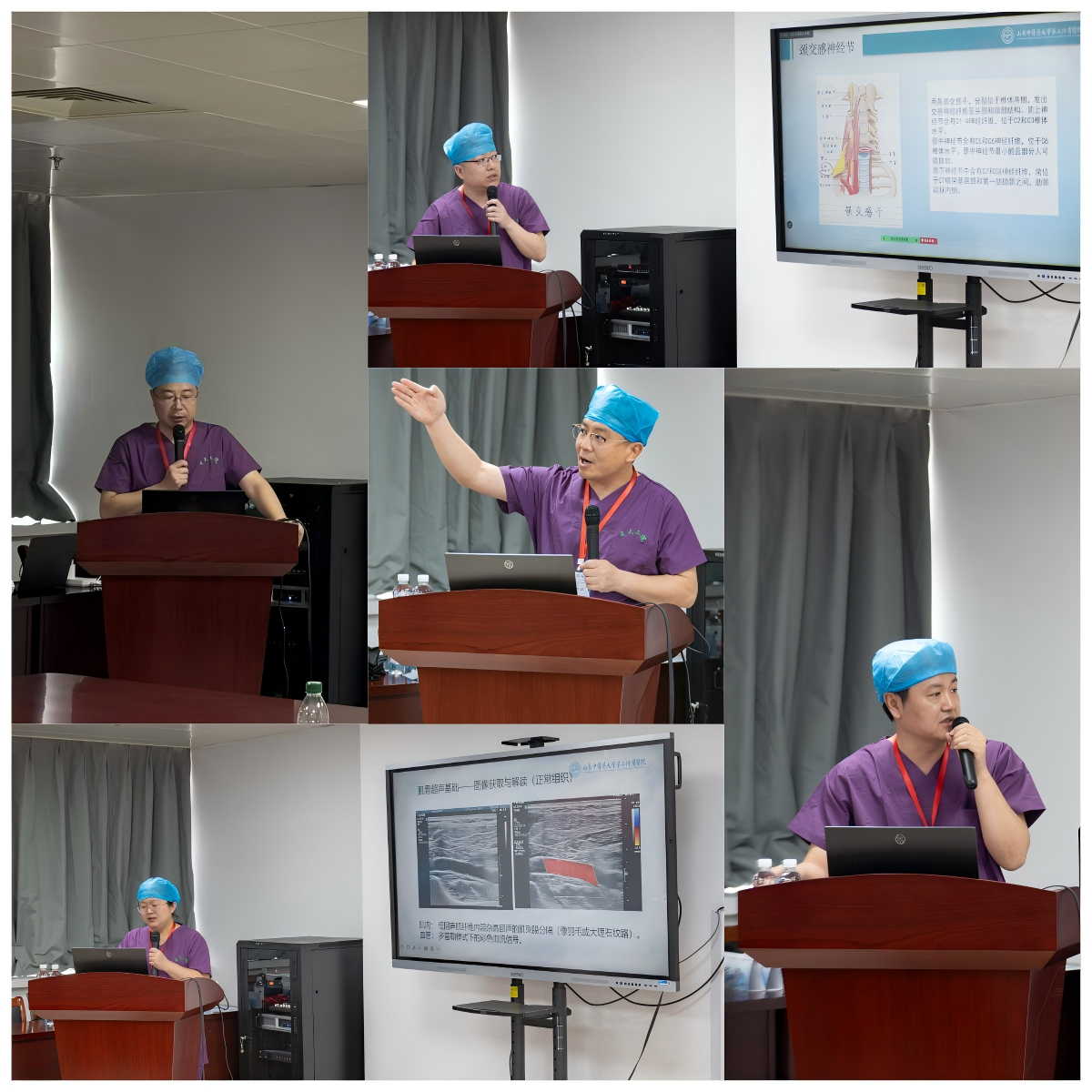 本次学习班设置“理论授课、专家讲座、Workshop 实操、手术现场演示”四大模块,课程设置科学实用、贴合临床。理论教学环节,首都医科大学附属北京朝阳医院武百山教授、清华大学附属北京垂杨柳医院李健教授及我院王磊、李义春、薛景才、于娜娜、吕耐山等专家,围绕肌骨超声基础、超声引导下神经阻滞与关节治疗、脊柱疼痛微创治疗、颈腰椎间盘射频镇痛等专题,系统讲解技术原理、适应症、操作规范及临床经验,理论与实践结合紧密。