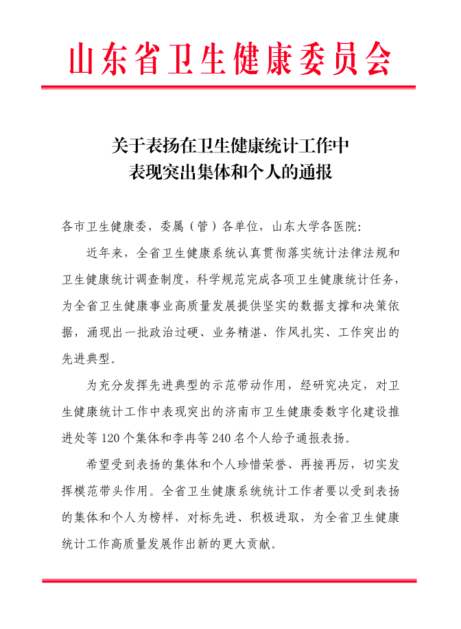 近日,山东省卫生健康委发布表彰通报,对全省卫生健康统计工作先进典型予以表扬。我院医务部获评“卫生健康统计工作表现突出集体”,医务部主任姬琳、病案统计室主任黄炳花荣获“卫生健康统计工作表现突出个人”称号。