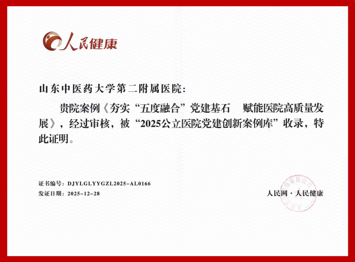 “五度融合”体系的深入实践,显著提升了我院党的建设质量与引领效能,在组织建设、发展实绩、价值认可、经验传播等方面取得了系统性丰硕成果。一是在组织基础上树立全国标杆。两个党支部战斗堡垒作用突出,分获教育部首批“全国党建工作样板支部”、国家卫健委“临床科室标杆党支部”称号;其中一个支部入选教育部全国高校支部风采展,工作案例入选中共山东省委教育工委编印的《山东高校基层党建典型案例50篇》。二是在引领发展上取得系列突破。医院核心实力持续攀升,近年来先后获评全国中西医协同“旗舰”医院试点项目、国家中医药管理局智慧中医医院试点项目、全国中医康复中心建设单位,获批成为国家儿童青少年脊柱侧弯中医药干预试点省牵头单位,其负责开展的儿童青少年脊柱侧弯中医药干预省级试点,被列入2025年度山东省20项重点民生实事。同时,医院获评山东省省级文明单位。三是在创新价值上获得国家级权威认可。本次“五度融合”案例成功入选人民网国家级案例库。四是在经验影响上形成广泛辐射。医院党建工作的整体经验,获国家中医药管理局官微推介,在全国公立医院党建工作会上作交流发言,形成了可复制、可推广的实践样本。